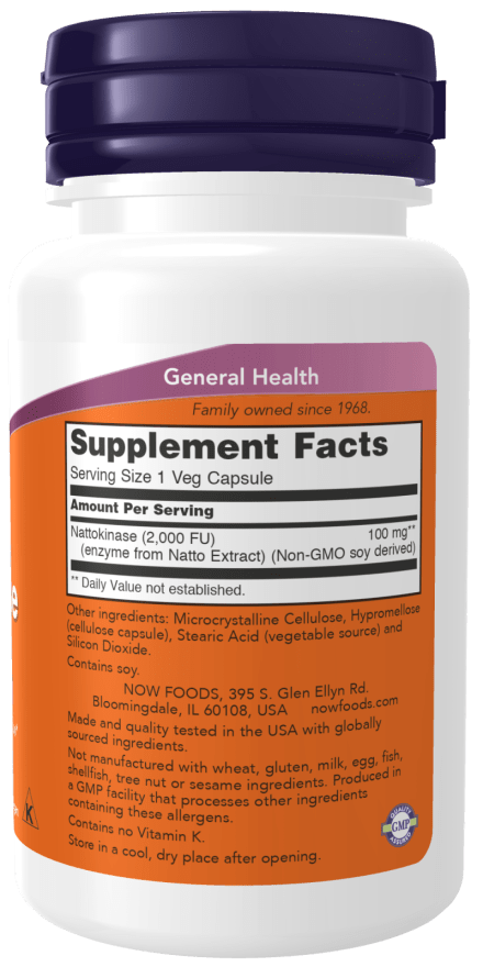 NOW® Nattokinase is derived from non-GMO soy and has 2,000 FUs (Fibrinolytic Units) per 100 mg serving.