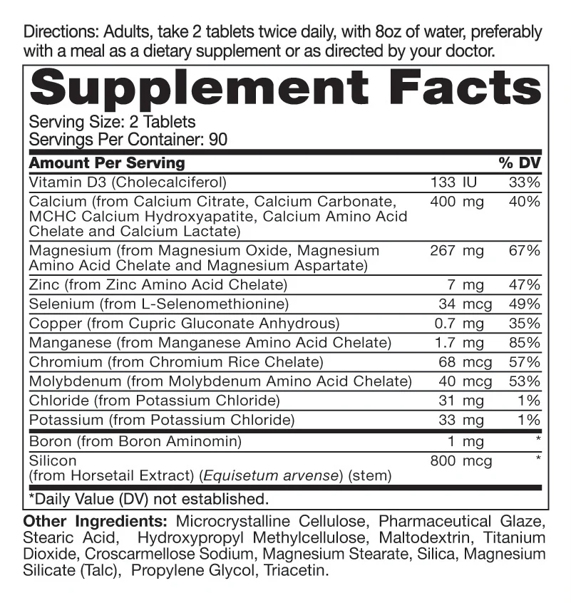 Roex combined scientifically-formulated ingredients to offer a potent dosage for optimal bone health support. Two additional mineral supplements found in the ultimate calcium mineral formula are magnesium and zinc. Three forms of magnesium oxide, magnesium aspartate, and magnesium chelate are included in the formula for improved absorption. Also, Zinc is an essential element necessary for sustaining all life, and acts as an activator of certain enzymes that are important in the transport of carbon dioxide in the blood.*